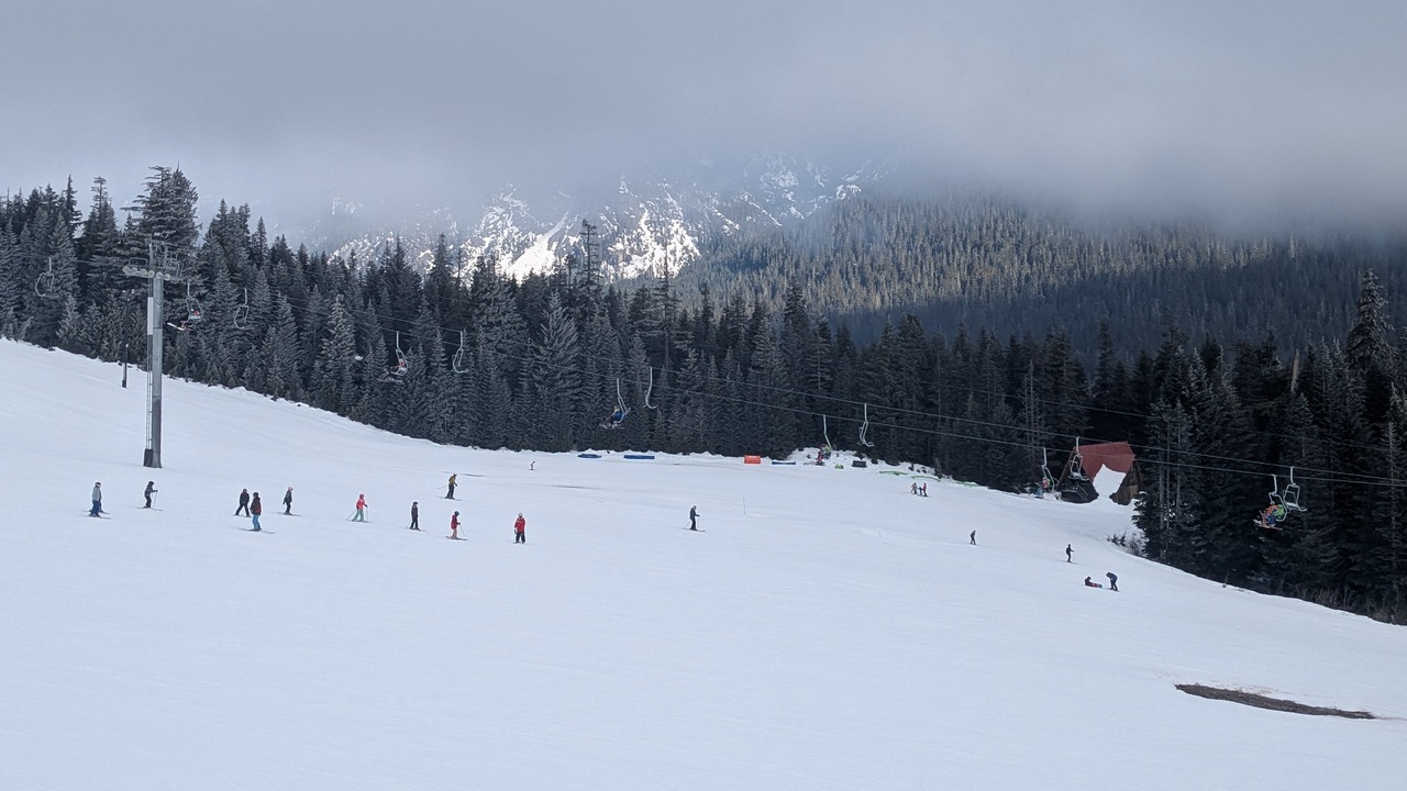 а на горке всё плохо. даже нижние спуски подходят к концу. а на верних просто пусто. муж девочки рыпнулся наверх, испытать новые лыжи и вернулся обратно почти в слезах. я понимаю его